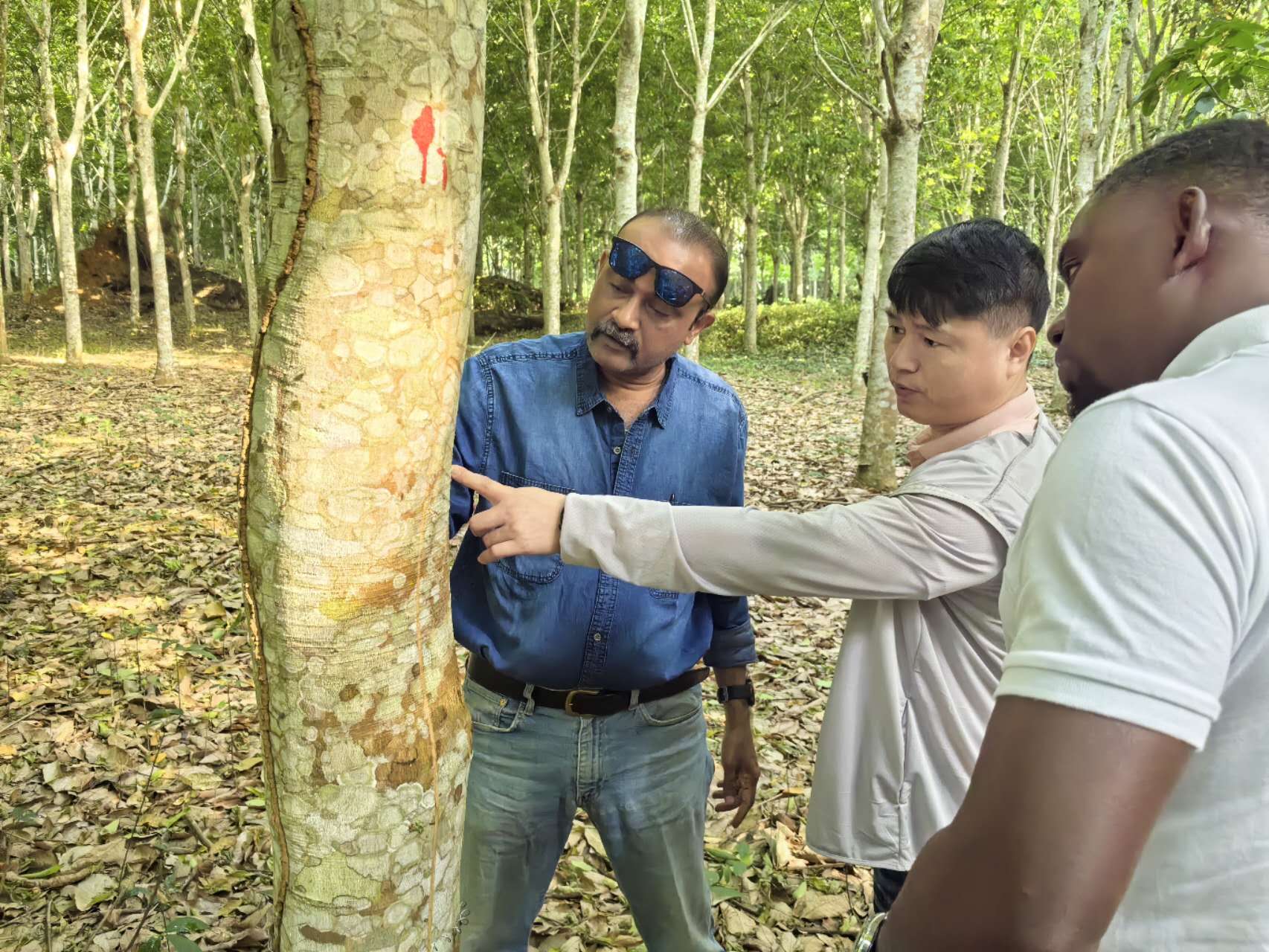 在喀麥隆種植園的每一天都充滿了新奇和挑戰(zhàn),但正是這種異國(guó)他鄉(xiāng)的體驗(yàn),讓我更加深刻地了解文化的多樣性和世界的廣闊,行萬里路與讀萬卷書有異曲同工、殊途同歸的作用,能夠讓我增長(zhǎng)見識(shí),開闊眼界。何興輝查看當(dāng)?shù)啬z工割膠情況。 “何總,何總,你快看看我是不是遭遇電信詐騙了?”有一天,同為海南橡膠赴非專家團(tuán)成員的虞海濃神情